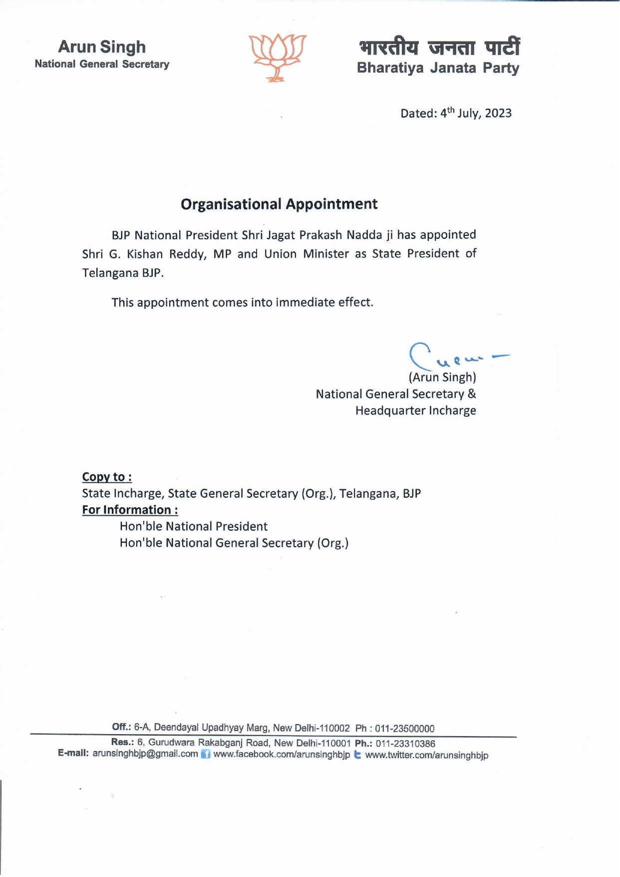 The BJP on Tuesday appointed Reddy as the new BJP president in Telangana and directed him to take immediate charge. The outgoing president, Bandi Sanjay faced the ire of rank and file in the party and also several leaders and cadres were upset with his style of functioning, and had made several complaints against him to the central leadership. It is reliably learnt that another significant leader also did some plain talking, and after several rounds of discussions a decision was taken to replace Bandi Sanjay, who was asked to step down by the central party leadership. While, the replacement of the state BJP unit chief was a common demand of many leaders from the state, the central leadership also placated another prominent local leader Etala Rajender by making him the chairman of the state campaign committee. Etala was also being mentioned by local media to be among the BJP leaders trying to cross over to the Congress.